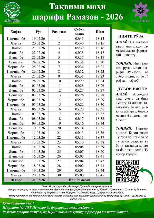 Ширкати NAJOT тамоми муштариён, ҳамкорон ва дӯстони гиромиро бо фарорасии моҳи шарифи Рамазон самимона табрик менамояд. Орзумандем, ки ин моҳи пурбаракат барои шумо ва наздиконатон моҳи имон, сабр, бахшиш ва раҳмат бошад. Бигзор дуоҳоятон мустаҷоб гарданд, хонадонатон пур аз оромӣ ва дилҳоятон саршор аз нуру умед бошанд.